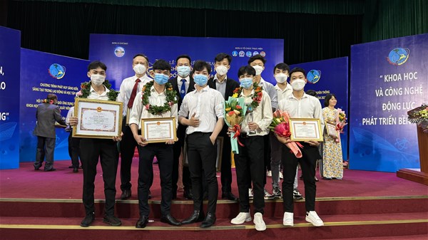 Giải Khuyến Khích: Tên đề tài " Thiết bị khám và cấp thuốc tự động cho bệnh nhân Covid đang điều trị tại các bệnh viên dã chiến", Nhóm tác giả: Hoàng Ngọc Tân, Phạm Văn Toản, Nguyễn Đình Hải, Phan Văn Tân, Cao Thế Vinh, Lê Minh Hưng