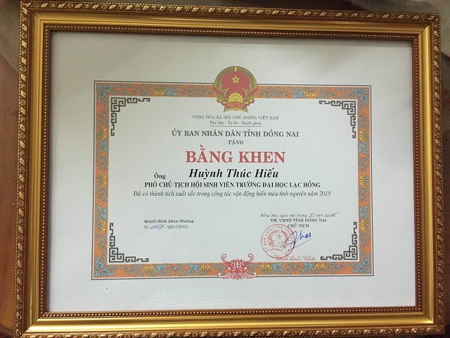 Năm 2015, Đồng Nai có trên 29.000 người đăng kí hiến máu. Thường trực Ban Chỉ đạo vận động hiến máu tình nguyện toàn tỉnh đã tổ chức được 189 đợt lưu động trong đó trường Đại học Lạc Hồng định kỳ hàng năm phối hợp cùng Hội chữ thập đỏ, Trung tâm truyền máu Chợ Rẫy tổ chức 02 đợt hiến máu nhân đạo với số lượt người tham gia hơn 1000 người và số đơn vị máu tiếp nhận gần 800 đvm nhằm đáp ứng nhu cầu cấp thiết của các bệnh viện trong tỉnh để phục vụ cho việc cấp cứu và điều trị bệnh nhân. Với thành tích đó, trường ĐH Lạc Hồng đã được Ban chỉ đạo quốc gia xét tặng đĩa Bạc cho NGND – TS. Đỗ Hữu Tài – Hiệu trưởng nhà trường; tập thể Đoàn Thanh niên nhà trường; đ/c Huỳnh Thúc Hiếu – UV. BTV Đoàn trường, Phó Chủ tịch Hội sinh viên trường được UBND tỉnh Đồng Nai tặng bằng khen có thành tích xuất sắc trong công tác vận động hiến máu tình nguyện năm 2015.