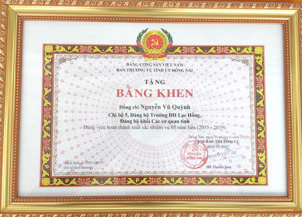 Đại học Lạc Hồng vinh dự với 4 Đảng viên nhận được bằng khen của Tỉnh ủy Đồng Nai là Đảng viên hoàn thành xuất sắc nhiệm vụ 5 năm liền 2015 – 2019.