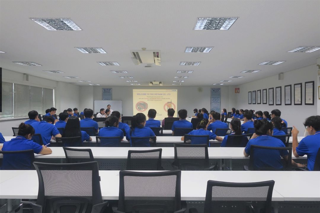 Sinh viên đã có cơ hội tiếp cận môi trường làm việc quy mô lớn, chuyên nghiệp và hiện đại của YKK – doanh nghiệp nổi tiếng toàn cầu trong lĩnh vực sản xuất khóa kéo và phụ kiện may mặc. Chuyến đi mở đầu bằng việc giới thiệu tổng quan về lịch sử, văn hóa doanh nghiệp và hệ thống vận hành của công ty.