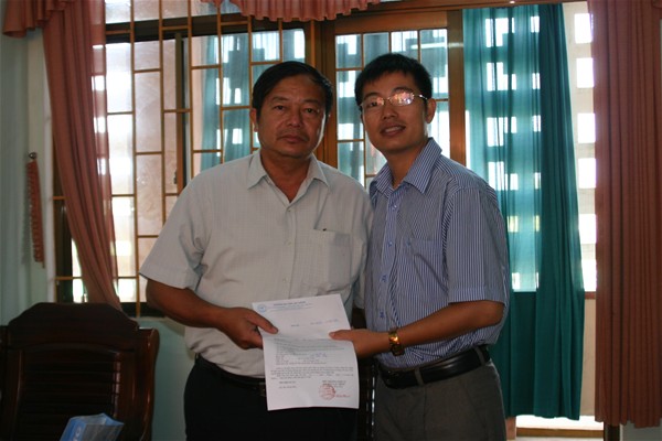 Ts. Nguyễn Văn Tân trao học bổng cho trường THPT Trần Quang Diệu (Thầy hiệu phó Nguyễn Dũng đại diện nhận)