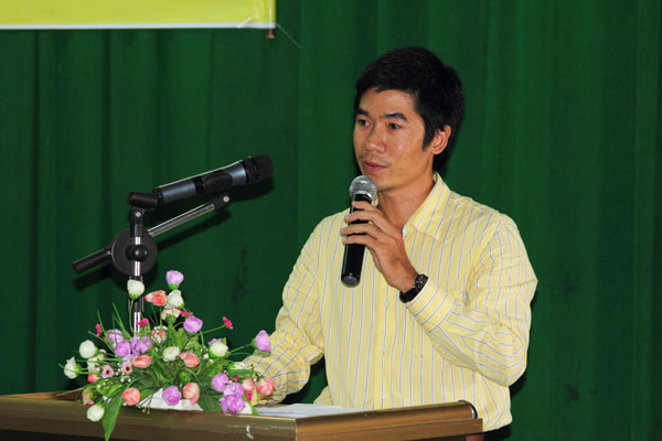 MA Nguyen Ba Thuan makes a report on Robocon achievements at the ceremony.