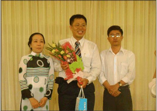 Mr Son and Ms Trang present flowers and souvenir gift to the company's representative.