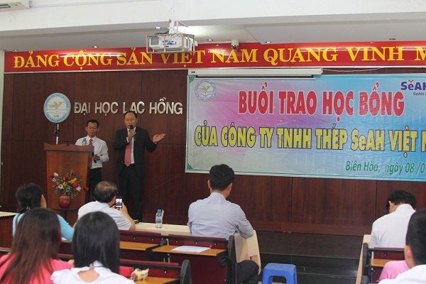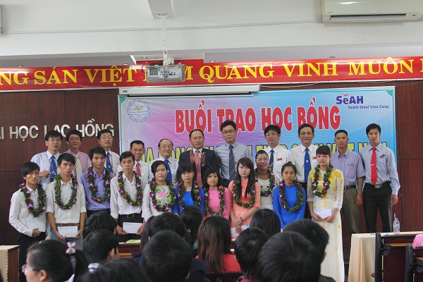 The scholarship awarding ceremony was organized at Room B 203 – Campus 1 – Lac Hong University with the attendance of the Chief of the Dong Nai province’s Department of Education and Training Phan Dinh Chuong, Vice rectors of Lac Hong University Dr. Diep Cam Thu, Dr. Nguyen Van Nam and Lam Thanh Hien, M.A, Director of Enterprise Relations and Student Support center Tran Dung, M.A, General Manager of SeAH Steel Vina Corp. Nam Hyung Kun and Deputy General Manager Park Sang Yong.