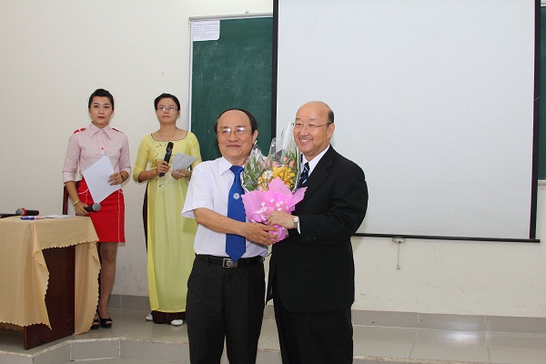 On behalf of the University Management Board, Vice Rector Dr. Diep Cam Thu present flowers to the speaker Mr. Fumio Okita.