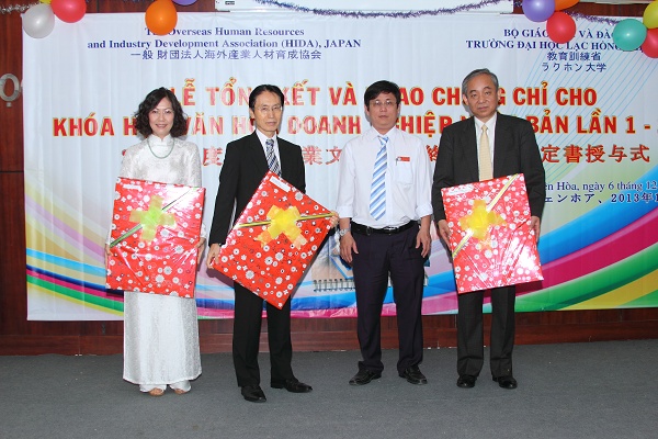 Recently, Lac Hong University in cooperation with HIDA (The Overseas Human Resources and Industry Development Association, Japan) held a ceremony to close Japanese Business Culture Course and grant certificates of completion to 65 senior students of Japanese Studies. The program took place at room B 203 with the participation of Management consultant Mr. Takeda Sadao; Management consultant and lecturer of Japanese Corporate culture Mr. Masayuki Matsumura; LHU's Vice Rector and Head of Academic Affairs Department Lam Thanh Hien, MSc.; Vice Dean of Oriental Studies Nguyen Huu Nghi; Head of Japanese Studies branch Nguyen Thi Nhu Thuong, M.A.