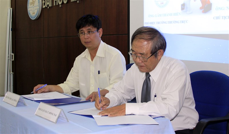 In the morning of October 25, Vice Rector Lam Thanh Hien on behalf of LHU Management Board signed a cooperation agreement with Chairman of Dong Nai provincial Lawyers' Association Nguyen Duc. Director of Enterprise Relation and Student Support Center Tran Dung and Dean of International Business Administration Faculty Nguyen Van Tan also attended the signing ceremony. The agreement focused on cooperation in training students of Economic Law major.