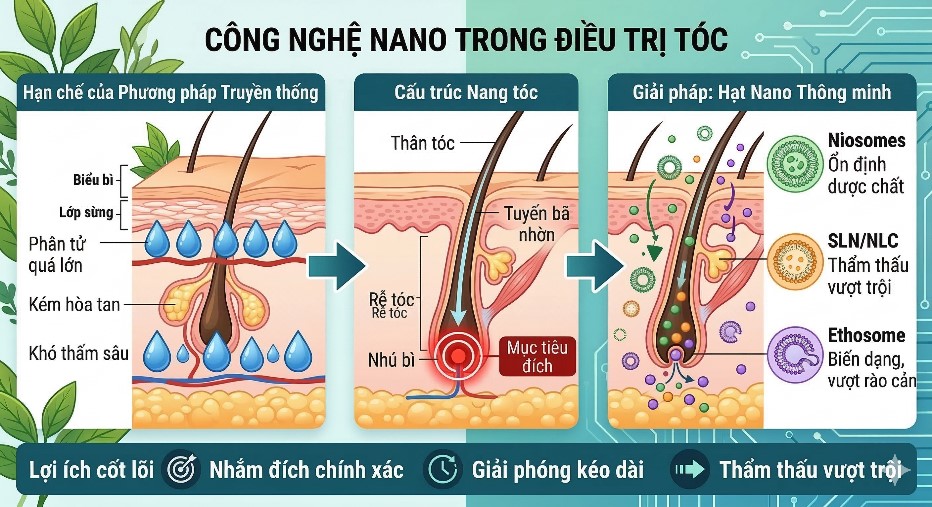 - Ưu điểm vượt trội: Các hệ thống vận chuyển nano giúp tăng độ hòa tan, ổn định hoạt chất, giải phóng có kiểm soát và cho phép nhắm mục tiêu chính xác vào nang tóc.