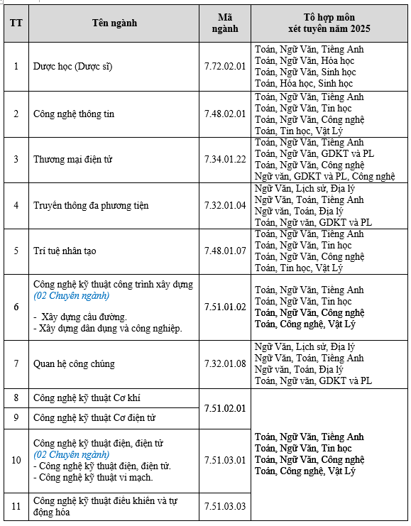 - Xét tuyển theo kết quả thi tốt nghiệp THPT 2025 do Bộ GDĐT tổ chức.