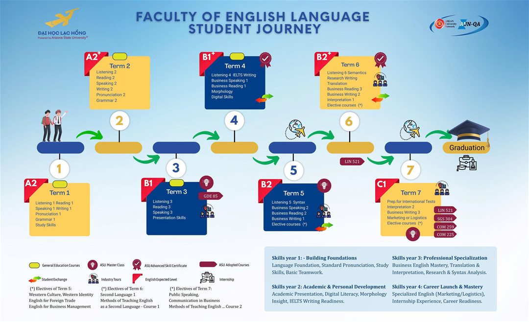 FEL Student Journey at Lac Hong University is a comprehensive four-year roadmap designed to take students from foundational English skills to professional mastery and career readiness. This journey is divided into eight terms, aligned with the Common European Framework of Reference for Languages (CEFR) levels.